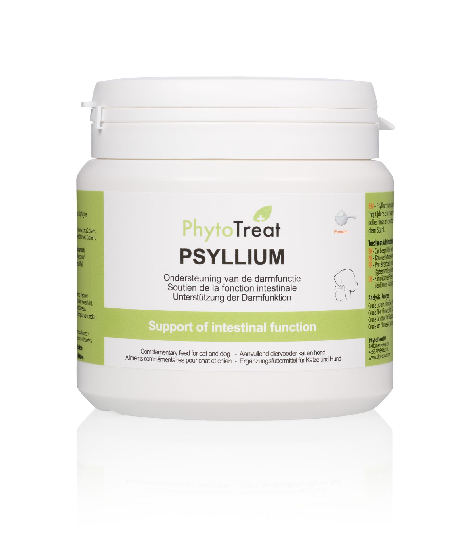 Kan over het voer verdeeld worden met wat extra vocht. Bij dunne ontlasting Psyllium slechts